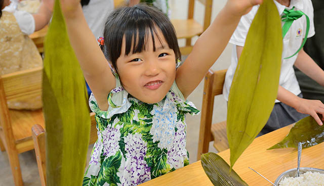 On June 14th parents and grandparents of Hui Xin campus were invited in to celebrate "Dragon Boat Festival" by making "Zong Zi" sticky rice dumplings, wrapped in bamboo leaf and boiled for snacks. It was also a spirit day, where students and teachers could wear either green, golden or yellow colors. K1 classes had decorated the lobby with dragon boat's in the water display and paddles of many designs and colors hanging from the ceiling.