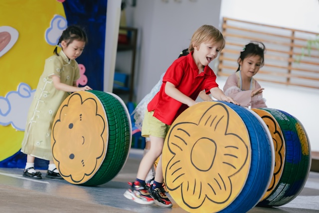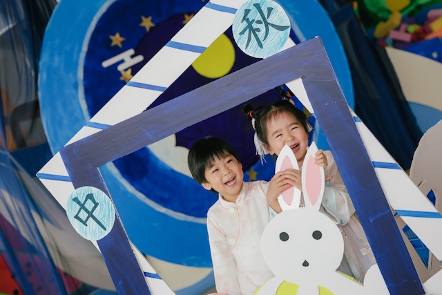The campus was elaborately decorated as a "Moon Palace" themed playground with a wealth of interesting games, such as "The moon touches the sea!”, "Helping the moon home", "Shaping moon cakes, "Adventure on the moon". From Pre-nursery to K2, children from different levels immersed themselves in playing games and experienced the joy of the festival full of vigor and surprises.